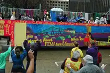 Louisiana State troopers and National Guard assisted with crowd control for the first time since 1979. Many of the floats had been partially submerged in the floodwaters for weeks. While some krewes repaired and removed all traces of these effects, others incorporated flood lines and other damage into the designs of the floats. Most of the locals who worked on the floats and rode on them were significantly impacted by the storm, and many had lost most or all of their possessions, but their enthusiasm for Carnival was even more intense than usual and celebrated as an affirmation of life. The themes of many costumes and floats had more barbed satire than usual, with commentary on the trials and tribulations of living in the devastated city, with references to MREs, Katrina refrigerators and FEMA trailers, along with much mocking of the Federal Emergency Management Agency (FEMA), and local and national politicians.