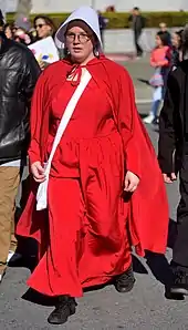 In her dystopian novel The Handmaid's Tale (1985), all the developments take place near Boston in the United States, now known as Gilead, while Canada is portrayed as the only hope for an escape. To some this reflects her status of being "in the vanguard of Canadian anti-Americanism of the 1960s and 1970s".[123] Critics have seen the mistreated Handmaid as Canada.[124] During the debate in 1987 over a free-trade agreement between Canada and the United States, Atwood spoke out against the deal and wrote an essay opposing it.[125] She said that the 2016 United States presidential election led to an increase in sales of The Handmaid's Tale.[126] Amazon reported that The Handmaid's Tale was the most-read book of 2017.[127]