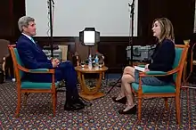 At a press conference on September 9, 2013, she asked Secretary of State John Kerry about any possibility for the Syrian government to avoid a U.S. strike. Kerry's answer, that Assad could "turn over every single bit of his chemical weapons to the international community in the next week"[22] (although later his answer was retracted as "a rhetorical argument about the impossibility and unlikelihood of Assad turning over chemical weapons he has denied using" by a State Department spokesperson), led Russia's foreign minister Sergey V. Lavrov to propose this as a solution to the crisis.[23]