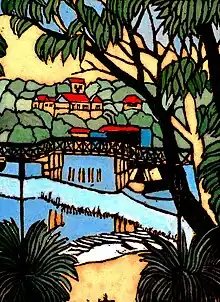 Mosman and its environs also featured in many of Preston's prints.[3] One of the Prestons' flats (in Musgrave Street) afforded views of Mosman Bay and Mosman Bridge that turned up in more than half a dozen different prints.[3] Another flat, near Reid Park, had views of Sydney Harbor and its foreshore that featured in such iconic works as Sydney Head I (1925), Sydney Head II (1925),[15] and Harbour Foreshore (1925).[3] The harbour also appears in the works Circular Quay (1925)[16] and The Bridge from the North Shore (1932).[3] There are also prints with landscape subjects, such as Red Cross Fete (1920)—a view across the water from Balmoral Island at night—and Edwards Beach Balmoral (1929) and Rocks and Waves (1929),[17] which are both views from Wyargine Point near Edwards Beach.[3]