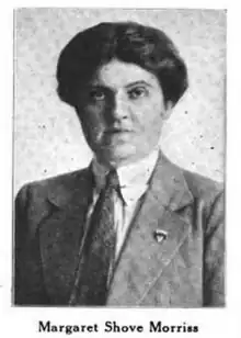 Morriss began her career at Mount Holyoke College, teaching American history. While there, she was active in the local chapter of the College Equal Suffrage League.[5] In 1923, she was hired by Brown University to serve a professor of history and as Dean of Women,[6] a post she held until she retired in 1950. She more than doubled the number of women enrolled at Brown during her tenure, and saw the 1927 creation of a Women's Building on campus.[7] Her name was sometimes lampooned as "Peggy Push" (from "Margaret Shove"), to emphasize her assertive style of leadership. In 1951, Brown established a Margaret S. Morriss Scholarship in her honor.[2] A dormitory built in 1960 was named for Morriss.[8]