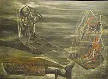 During the Second World War, while FitzGerald worked at Boeing, Tomkins gave birth to the first of their three children. She supplemented their income with ceramic works, and began working with egg tempera while sketching out new directions for her painting.[3] In addition to painting, Tomkins and FitzGerald were both fine craftsmen and sculptors, working in ceramics and even furniture design. Their Modernist ceramics were mostly utilitarian objects such as bowls, vessels and lamps, done in a unique and imaginative style.[4] Works by Tomkins appeared in several annual shows at the Whitney in New York and the Corcoran Gallery in Washington, D.C., and in 1947 three of her pieces were selected for inclusion in the Abstract and Surrealist American Art exhibit at the Chicago Art Institute. That same year, a one-person show of twenty-three of her paintings was mounted at the Palace of the Legion of Honor in San Francisco alongside a solo exhibition of prints by surrealist artist Roderick Mead;[5] these works were also shown at the Seattle Art Museum.[3] At this time, with only a handful of small galleries (such as Zoe Dusanne's and Otto Seligman's) showing modern art in Seattle, Tomkins was looking beyond the confines of the Northwest for both inspiration and reaction.