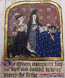 Many letters written by Margaret during her tenure as queen consort are still extant. One was written to the Corporation of London regarding injuries inflicted on her tenants at the manor of Enfield, which comprised part of her dower lands.[36] Another letter was written to the Archbishop of Canterbury.[37][38] Margaret's letters, which typically began with the words "By the Quene,"[39] are compiled in a book edited by Cecil Munro published for the Camden Society in 1863.[40]