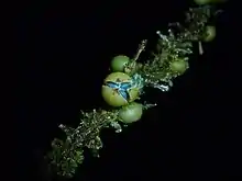 The fruit is a bright iridescent blue color, resulting from a complex surface structure which interferes with light waves.