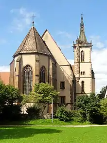 The new church was consecrated in 1483 by Albrecht, Bishop of Strasbourg, and was completed in 1488.[5] At the time of consecration, the friars of All Saints' Abbey took over the supervision of the building and its funding.[1][4] The church is dedicated to the Coronation of Mary, John the Baptist and John the Evangelist.[1][7]