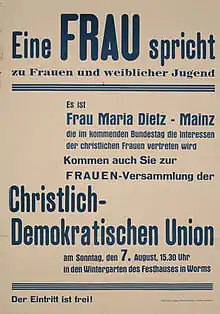 Announcement poster for a CDU women's assembly with Maria Dietz on the occasion of the 1949 federal elections