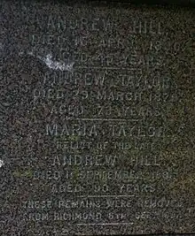 Andrew Hill & Maria had two children, Jessie & Margaret Lindsey Hill. Andrew Hill died in 1830. Maria remarried Andrew Taylor, a Sergeant from the 100th Foot. They lived the remainder of their lives in Richmond, Ontario. Andrew Taylor died 29 March 1879, aged 79 years and Maria died 11 September 1881, aged 90 years. She left her estate to the St. John's Anglican Church in Richmond for a new church spire.[3]: 45 Maria and both husbands were eventually interred at the National Beechwood Cemetery in Ottawa in the family plot of Edward Malloch II her son-in-law.