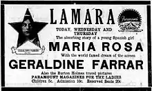Maria Rosa is a surviving 1916 American silent drama film directed by Cecil B. DeMille. It was based on a 1914 Broadway stage play Maria Rosa by Àngel Guimerà. On the stage the principal parts were played by Dorothy Donnelly and Lou Tellegen, future husband of this film's star Geraldine Farrar.[2][3]