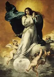 Drawing on the emblem tradition, Francisco Pacheco established an iconography that Spanish artists such as Bartolomé Murillo (especially), Diego Velázquez (Pacheco's son-in-law) and others adopted, with variations, and then spread to the rest of Europe, since when it has remained the usual depiction. Additional imagery may include clouds, a golden light, and cherubs. In some paintings the cherubim are holding lilies and roses, flowers often associated with Mary.