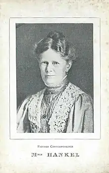 Hankel née Dippe was born in 1844 in Schwerin, Germany. In 1905 she learned Esperanto and subsequently wrote poetry and prose in that language. Her titles include La simbolo de l' amo (The symbol of love), Tri unuaktaj komedioj (Three first-person comedies), and Sableroj (Sands).[2] In 1909 she participated and won the literary contest Internaciaj Floraj Ludoj (International Floral Games). In 1910 she spoke in support of women's suffrage at the annual World Esperanto Congress in Washington, D.C. In 1911 she founded and became the first president of the Esperantista Literatura Asocio (Esperanto Literature Association) at that year's World Esperanto Congress in Antwerp.[3]