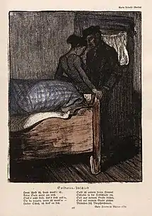 Earlier that year, Schnür had secretly given birth to a son (Klaus) in Paris; probably from a relationship with the artist Angelo Jank, although some sources point to August Gallinger, a medical student who would later become known for his exposé of crimes committed against German POWs during World War I.[2] At first, she was forced to leave Klaus with her parents in Swinemünde, but accepted an offer from Marc to enter into a marriage of convenience so she could gain custody.[3] After only a year, she divorced Marc, charging him with adultery, and thereby prevented him from marrying Franck until 1911, because a dispensation was required.