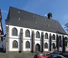 A parish is attested in Lich in the year 1239, which presupposes a church existed by that date.[3] In 1316, the Marienstift was founded by Philip III of Falkenstein, as a collegiate church (German: Kollegiatstift) with ten canons, which was intended to educate young men for the priesthood. Three neighbouring churches were incorporated along with Lich.[4] A large amount of property of the surrounding churches and districts was donated for the maintenance of the college. In the year of the college's foundation, a new, stone church was begun which was roughly two-thirds the size of the present building. The hall church, with a long choir and rood screen was consecrated to Mary on 7 May 1320.[1] It survived less than two hundred years. In 1510 it was entirely demolished to make way for the construction of the present building on the same site. Only a few sections of wall in the west wall survive.[3]