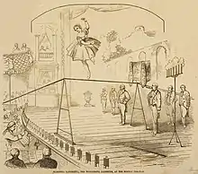 She performs the same feats on the corde tendue, which we think surprising in a dancer on the firm floor. She runs backwards and forwards, turning with incredible rapidity, dances on the rope, stands on the point of one toe, descends the angle of the rope into the parterre, and re-ascends unfaltering and fearless. Indeed her doings are unexampled. She would, like Madame Saqui, have ascended from the stage to the gallery, had she been permitted by the management.