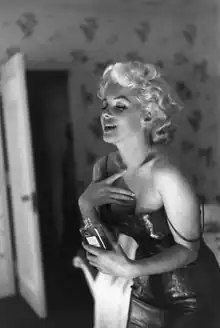 While still in character, Monroe posed over the updraft of a New York City subway grating during the filming of The Seven Year Itch in Manhattan.[165][166][167] The scene has been imitated on numerous occasions since the film was released.