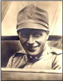 In May 1912, he returned to Italy and moved to the Aeronautical Service within the then dependent on the Arma del Genio, attending the Caproni School in Somma Lombardo where he obtained his pilot's license.[3] In October 1912 at Vizzola Ticino, while testing a Caproni apparatus, he was involved in an accident in which he injured his head while the chief engineer of the school, Francesco Piccoli, fell victim. He became director of the Vizzola Ticino aerodrome and in 1914 went to Libya where thanks to his technical and organizational qualities, was able to make the most out of the few available aircraft. He then obtained his military pilot license at the Aviano airfield on June 14, 1914.