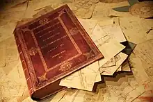 The rebuilt copy of Leonardo da Vinci's Codex Atlanticus as a box. Made by Mario Taddei for museum purposes.