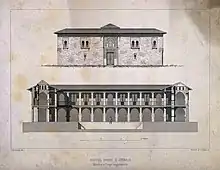 The layout and shape of the building is known thanks to 19th-century plans and drawings made by Francisco Enríquez Ferrer and Jules Gailhabaud, as well as thanks to modern archeological investigations.[4] Many of its elements had similarities to the Nasrid-era caravanserai known today as the Corral del Carbón.[3]