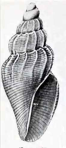 The solid, yellowish white shell has a subfusiform shape. It contains 5 rounded whorls, including a large protoconch of two rounded polished whorls. The other whorls are strongly ribbed by distant curved ribs, about 12 on the spire. On the body whorl they disappear above the middle. The whole shell is girt by numerous irregularly spaced impressed lines, which pass over the ribs. The aperture is elongate, oval, with no contraction for a siphonal canal. The outer lip is thin, curved, with a moderate sinus at the suture, which bends the ribs. The columella is straight.[2]