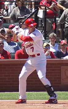 The Cardinals hoped that the addition of DeRosa would improve their offense.[79] Soon after his acquisition, however, he was placed on the disabled list with a left wrist sprain, an injury that kept him out from July 1 through July 17.[51] From July 26 through 28, he hit home runs in three straight games for the second time that season.[51] On August 4, he was hit by a pitch with the bases loaded in the 10th inning of a game against the Mets, forcing in the winning run in a 12–7 victory over New York.[80] In 68 games (237 at bats), he batted .228 with 54 hits, 10 home runs, and 28 RBI. Defensively, he committed no errors as a Cardinal.[51] Playing 139 games combined between Cleveland and St. Louis, he batted .250 with 129 hits, a career-high 23 home runs, and 78 RBI.[1]