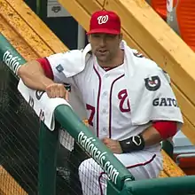 On December 22, 2011, DeRosa signed a one-year contract with the Washington Nationals.[93] Now 37 years old, he started at several positions for the Nationals in April 2012 but batted .081 in 13 games.[94] On April 29, DeRosa was placed on the disabled list with a left oblique strain, an injury that kept him inactive until June 25.[51] From then on, most of his appearances throughout the season were as a pinch hitter.[94] He went on the disabled list again from August 5 to September 1 with a left abdominal injury.[51] Despite DeRosa's limited playing time, he became an important mentor for his Nationals teammates, many of whom were much younger, including former first overall draft picks Bryce Harper and Stephen Strasburg.[95][96] In 48 games (85 at bats), he batted .188 with 16 hits, no home runs, and six RBI.[1]