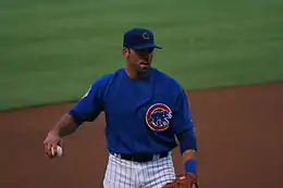 On December 31, 2008, DeRosa was traded to the Cleveland Indians for minor league pitchers Jeff Stevens, Chris Archer, and John Gaub.[75] Prior to the 2009 season, he represented the United States in the World Baseball Classic. He batted .316 and led the team with nine RBI before Japan eliminated them in the semifinals.[51] Though third base would be his primary position for the Indians, he also spent time at first base and in the outfield.[76] On April 18, he had six RBI in a 22–4 victory over the Yankees.[77] From June 14 through June 16, he hit home runs in three consecutive games.[51] He received a standing ovation from Cubs fans when he returned to Wrigley Field on June 19, even though he was now with a different team.[78] On June 27, DeRosa was traded to the Cardinals for relief pitchers Chris Perez and Jess Todd.[79] In 71 games (278 at bats), he was batting .270 with 75 hits, 13 home runs, and 50 RBI.[1]