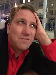 Kostabi was born in Los Angeles on November 27, 1960, to Estonian immigrants Kaljo and Rita Kostabi.[1][2] He was raised in Whittier, California and studied drawing and painting at California State University, Fullerton.[3] In 1982 he moved to New York and by 1984 he became a prominent figure of the East Village art scene,[4] winning the "Proliferation Prize" from the East Village Eye for being in more art exhibitions than any other New York artist.