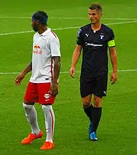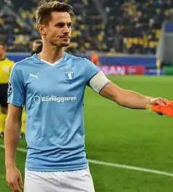 Ahead of the 2015 season, it was announced that Rosenberg was the new captain for Malmö FF, succeeding Molins.[285] Rosenberg started the season well scoring two goals in the four Svenska Cupen matches.[286][287] In a 4–1 win against GIF Sundsvall in the opening game of the season, he scored and set up the club's second goal of the game.[288] Having been linked a move away from Malmö FF earlier in the season, Rosenberg put the transfer rumours aside when he signed a contract extension with the side, keeping him until 2017.[289][290] From the start of the 2015 season, Rosenberg retained his first team place as well as his captaincy of the side.[291][292][293][294][295] He only scored two goals in the next three months, which came against Hammarby on 20 April 2015 and another came against Åtvidabergs on 31 May 2015.[296][297] Between mid–July and August, Rosenberg began a goal scoring spree, adding eight goals to his tally.[298][299][300][301][302] One of the goals came in Malmö's 3–0 return leg win over Red Bull Salzburg in the third qualifying round for the 2015–16 UEFA Champions League on 5 August 2015.[303] Thanks to an aggregate score of 3–2, Malmö eliminated Salzburg for the second successive season, contributing to Salzburg's run of eight unsuccessful attempts to qualify for the Champions League since being purchased by the Red Bull company in 2005.[304][305] In their home match on 25 August 2015, Rosenberg scored the first goal as Malmö defeated Celtic 2–0, winning 4–3 on aggregate and thereby qualifying for the Champions League group stage for the second consecutive year.[306][307] He later scored four more goals later in the 2015 season, including a brace against Kalmar on 17 October 2015.[308][309][310] After serving a one-match suspension, Rosenberg returned to the starting line-up in the last game of the season against IFK Norrköping, only to be sent off in the 5th minute of the match, as Malmö lost 2–0.[311][312] Malmö FF were unable to follow up their success in European qualifying with a league title in 2015, disappointingly finishing in fifth place.[313][314] Having been out of the first team on three occasions during the 2015 season,[315][316][317] Rosenberg finished the season with 42 appearances and 16 goals in all competitions.