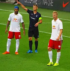 Rosenberg talking to referees and the opposition's players during a Champions League qualifier against Red Bull Salzburg in 2015.