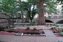 The Spanish Missionary, Father Damian Massanet, conducted the first Catholic Mass on this spot on June 13, 1691.[4] He went on to rename the river after Saint Anthony of Padua to honor his feast day.[5] Rolando Briseño was commissioned in 1991 to create a sculpture to commemorate this Mass.[6] The island is now the root ball of a cypress tree that was planted over 100 years ago. The island was originally kept so as not to cause permanent damage to the historic tree. It belongs to the City of San Antonio and the use of the island is controlled by Downtown Operations.[7]