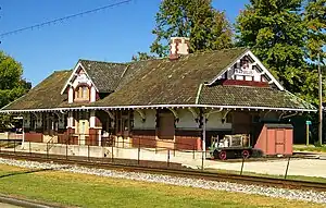 The depot is about 90 feet (27 m) by 25 feet (7.6 m) and built on a rectangular plan. It has two center bays, on either side of the building, one of which functioned as a ticket office. The structure was designed and built by T. S. Peak, a Chicago builder and cast in the American Craftsman architectural style. Despite having undergone extensive interior remodeling the building retains a high degree of its exterior architectural integrity.[2]