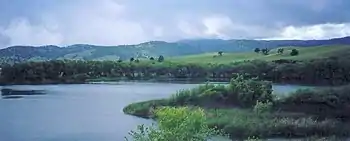 The Marsh Creek watershed drains about 100 square miles (260 km2) of the eastern slopes of Mt. Diablo and the neighboring portions of the Black Hills. Its upper tributaries are intermittent and small perennial streams which flow northwesterly until the creek turns east at Marsh Creek Springs. The creek was dammed downstream from the Springs in the 1960s, forming Marsh Creek Reservoir. The dam is south of Brentwood and north of the intersection of Marsh Creek Road and Camino Diablo Road.[4] Major tributaries are Briones, Dry, Deer and Sand Creeks. Briones Creek, which drains the undeveloped Briones Valley, flows into Marsh Creek at Marsh Creek Reservoir, which lies in Marsh Creek State Park (California). Dry, Deer, and Sand creeks all flow into Marsh Creek within the city limits of Brentwood.[5] The creek is largely channelized in the lower watershed, and includes a drop structure near the city of Brentwood that appears to be a complete passage barrier. The lower stretch of the creek includes 11 miles (18 km) from the outfall of the Marsh Creek Reservoir into the western Delta at the Big Break Regional Shoreline area of the Sacramento–San Joaquin River Delta northeast of the city of Oakley.[6]