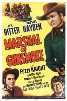 Marshal of Gunsmoke is a 1944 American Western film directed by Vernon Keays and written by William Lively. The film stars Tex Ritter, Russell Hayden, Fuzzy Knight, Jennifer Holt, Harry Woods and Herbert Rawlinson. The film was released on January 22, 1944, by Universal Pictures.[1][2][3]