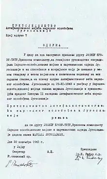 AVNOJ decision on promoting Tito to the rank of Marshal of Yugoslavia, signed by Ivan Ribar and Rodoljub Čolaković
