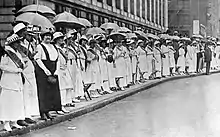 At age 7, Gellhorn participated in "The Golden Lane," a rally for women's suffrage at the Democratic Party's 1916 national convention in St. Louis. Women carrying yellow parasols and wearing yellow sashes lined both sides of a main street leading to the St. Louis Coliseum. A tableau of the states was in front of the Art Museum; states that had not enfranchised women were draped in black. Gellhorn and another girl, Mary Taussig, stood in front of the line, representing future voters.[9]