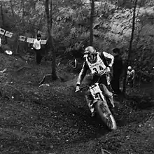 Harold Martin Lampkin (28 December 1950 – 2 April 2016) was an English professional motorcycle competitor. He competed in a variety of off-road motorcycle events, but specialized in observed trials competitions, winning the inaugural FIM Trial World Championship held in 1975.[1][2] In a genre of motorcycling competition that features balletic grace and acrobatic finesse, Lampkin was an iconoclast, using sheer momentum and physical strength to assault trials course sections.[3] He died in 2016 of cancer.[4]