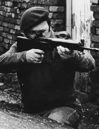 He was sworn in by Billy McMillen, and described joining as "a big occasion, like joining the priesthood".[2][4] In 1968 he was arrested for the first time, after he assaulted a member of the Royal Ulster Constabulary (RUC) during a civil rights march in Derry.[2] During the August 1969 riots in Belfast he was one of a handful of IRA members who tried to defend Catholic areas from attacks by Ulster loyalists,[5] and resigned as a result of the organisation's failure to adequately protect Catholic areas.[6] Meehan was arrested on 22 August 1969 for riotous behaviour, and was badly beaten before being imprisoned.[2][6] The beating was so severe Meehan was given the last rites, the first of four occasions on which he received last rites.[2] He was released after spending two months in prison.[6] After his release Billy McKee convinced Meehan to rejoin the IRA.[7] Meehan sided with the Provisional IRA following its split with the Official IRA in January 1970, and by mid-1970 was a senior IRA leader in the Ardoyne area.[8] On 27 June 1970 rioting broke out across Belfast following a parade by the Orange Order, and a gun battle started in the Ardoyne area.[8] Meehan stated: