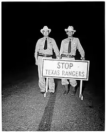 After showing his courage and valor dealing with the Ku Klux Klan, Burton was appointed a Texas Ranger in 1922 by Governor Pat Neff.[1] As a Ranger Burton was sent to the towns of Somerville and Borger, to clean up bootlegging and whiskey making operations.[1] On August 25, 1923, Texas Rangers Marvin Burton and R.D Shumate led a police raid on a large moonshining operation in Somervell County.[3] He became instrumental in helping maintain the law of Prohibition in Texas during its thirteen years. Recounting one encounter with a bootlegger Burton said, "the bootlegger started shooting. I returned the fire and they took him away to the Glen Rose funeral home".