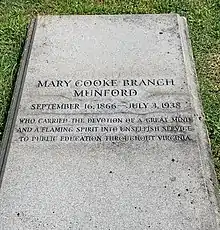Munford died in Richmond and was buried at Hollywood Cemetery, where her grave marker pays tribute to her legacy as an education reformer. Mary Munford Elementary School in the West End neighborhood of her hometown of Richmond, Virginia was named in her honor;[1] a historical marker detailing her contributions to Virginia education currently stands in front of it.[8] Munford Hall on the campus of the University of Virginia was the school's first female dorm, and today houses a portion of the International Residential College;[9] a former residence hall at William and Mary bears her name as well.[10] Her papers are currently held by the Library of Virginia.[11]