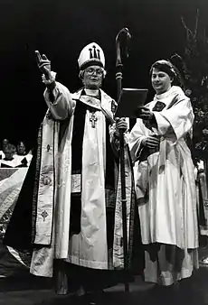 McLeod blessing the people at her consecration, November 1993. Her son, the Rev. Harrison McLeod, is at her side.