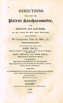 In 1802 the UK government held a board of enquiry so that they could decide on the approved way of measuring the alcohol content of drinks. Mary was one of the ten people who presented their instruments. The British excise authorities chose an instrument made by Bartholomew Sikes which meant that her device would not sell in the UK but her company's American monopoly remained.[1] She advertised herself as "the only proprietor of the patent" making saccharometers for measuring syrup, hydrometers for determining liquid density, and lacto-meters for measing the strength of milk.[3] Her hydrometer and lactometer are discussed in an article of the 1911 Encyclopædia Britannica. The article says that the Dicas hydrometer is too complex and the lactometer isn't accurate enough.[4]