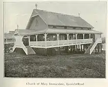 The parishioners constructed the building within 20 months and on Sunday 14 June 1914, Archbishop Duhig blessed and opened the new church/school. The church was named Mary Immaculate and situated where the Marymac Community Centre now stands. The first parish priest was Fr James Gallagher who transferred from St Joseph's Cathedral in Rockhampton. The church was a timber structure surrounded by a verandah and was able to hold 300 people. The original high altar was constructed of timber.[4]