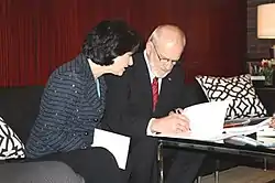 She received an eighty-percent pay increase for her job at North Carolina State University.[6] The raise she received was $90,300- a much larger raise than that received by other academic administrators, providing her with an annual salary of $170,000.[21][22][23] She was criticized by members of the North Carolina State Employees Association, who claimed she was given preferential treatment as the governor's wife.[6] The governor responded saying people were making an issue of Easley's raise because of her gender.[6] In June 2009 the university's board of trustees voted to terminate Easley's contract after newly released documents came forth indicating that her husband was involved in her hiring.[24][25][26] She began a formal grievance process following her termination.[27] Easley agreed not to sue the university for severing its contract with her.[28] In return, she received an additional $40,000 in annual pension benefits.[28][29]