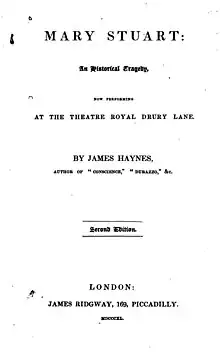 Mary Stuart is an 1840 historical tragedy by the Irish writer James Haynes. It is based on the assassination of David Rizzio, a courtier to Mary, Queen of Scots. The play was staged as part of an ambitious plan to relaunch the reputation of London's Theatre Royal, Drury Lane by the new manager William John Hammond, but faced issues of censorship from Charles Kemble and the Lord Chamberlain's office.[1]