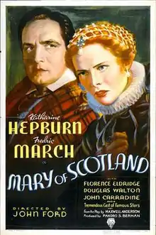 Mary of Scotland is a 1936 American historical drama film starring Katharine Hepburn as the 16th-century ruler Mary, Queen of Scots.[3][4] Directed by John Ford, it is an adaptation of the 1933 Maxwell Anderson play, with Fredric March reprising the role of Bothwell, which he also performed on stage during the run of play.[5] The screenplay was written by Dudley Nichols. Ginger Rogers wanted to play this role and made a screen test, but RKO rejected her request to be cast in the part[6] feeling that the role was not suitable to her image.