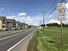 Maryland Route 180 (MD 180) is a state highway in the U.S. state of Maryland. Known for most of its length as Jefferson Pike, the state highway runs 14.95 miles (24.06 km) from U.S. Route 340 (US 340) in Knoxville east to Ballenger Creek Pike and Interstate 70 (I-70) in Frederick. MD 180 is the old alignment of US 340 through Knoxville, Petersville, and Jefferson in the Middletown Valley of western Frederick County. The state highway was originally constructed in the early 1910s and designated US 340 in 1927. MD 180 was assigned to the highway bypassed by the US 340 freeway between Sandy Hook in far southern Washington County and Jefferson in the mid-1960s. The state highway was extended east to Frederick and south along Ballenger Creek Pike (former MD 351) after the US 340 freeway was completed in the late 1960s. MD 180 was rolled back to Frederick and removed from Washington County in 1989.