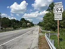 MD 194's bypass of Walkersville was completed around 1981.[23] The state highway's bypass of Woodsboro was under construction by 1995 and completed in 1997; Main Street through town was designated MD 194A.[24][25] MD 550, which ran concurrently with MD 194 along Main Street, joined the latter route on the new bypass and on a bypass section of its own at the north end of town.[25] In conjunction with the reconstruction of MD 26 as a divided highway from Market Street (then part of MD 355) in Frederick to Ceresville in 1997, the MD 26MD 194 intersection was reconfigured so the primary movement through the intersection is between MD 26 to the west and MD 194 to the north; the southernmost portion of MD 194 became an extension of the MD 26 divided highway.[26][27] This configuration was chosen because two-thirds of traffic passing through the intersection was between Frederick and Woodsboro.[27]
