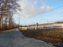 East of Commerce Street, MD 304 becomes bidirectional again. The highway's name changes to Railroad Avenue at Tilghman Avenue and to Ruthsburg Road at Kidwell Avenue, where state maintenance resumes. MD 304 leaves the town of Centreville as it passes southwest of Queen Anne's County High School. The highway continues through a double-roundabout partial cloverleaf interchange with US 301 (Blue Star Memorial Highway).[3] MD 304 heads southeast toward Ruthsburg, where the highway meets the northern end of MD 481 (Damsontown Road). The route continues east past the historic Thomas House and Hawkins Pharsalia on either side of the road's bridge across German Branch. MD 304 meets the eastern end of MD 405 (Price Station Road) opposite the historic home Stratton. The highway crosses Mason Branch of Tuckahoe Creek into Caroline County, where it follows Bridgetown Road to its eastern terminus at MD 312 (Oakland Road) in Bridgetown.[1][2]