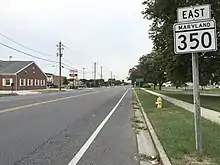 The first portion of MD 350 was constructed between Salisbury and Mount Hermon as a state-aid road by 1915; this highway was improved and brought into the state highway system by 1919.[3][4][5] Work began on the Mount HermonPowellville portion of the highway in 1929.[6] A small segment in Powellville and the section between Mount Hermon and Sixty Foot Road were completed by 1933.[7][8] The gap between Sixty Foot Road and the west end of Powellville was closed in 1935.[9]