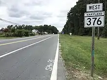 MD 376 begins at an intersection with MD 818 (Main Street) in Berlin. After intersecting the southern end of MD 377 (Williams Street), the state highway heads east as two-lane undivided Bay Street east to U.S. Route 113 (US 113, Worcester Highway) and leaves the town of Berlin upon traversing Hudson Branch. The highway's name changes to Assateague Road and MD 376 continues southeast through farmland and forest, intersecting Sinepuxent Road after crossing Trappe Creek. The state highway spans Ayres Creek before reaching its eastern terminus at MD 611 (Stephen Decatur Highway) in Lewis Corner.[1][2] The section of MD 376 east of US 113 provides access, along with MD 611, to the Maryland section of Assateague Island for traffic coming from US 113 from points north and US 50 from points west.[3]