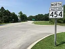 Maryland Route 454 (MD 454) is a state highway in the U.S. state of Maryland. Known for most of its length as Crown Stone Road, the state highway runs 2.21 miles (3.56 km) from the Delaware state line in Marydel, where the highway continues east as Delaware Route 8 (DE 8), north to MD 302 in Templeville. MD 454 was built in the late 1910s. The state highway originally ended in Marydel at MD 311, which crossed the state line. MD 454 replaced MD 311 along the stretch to the state line around 1946 and bypassed Marydel by 1956.